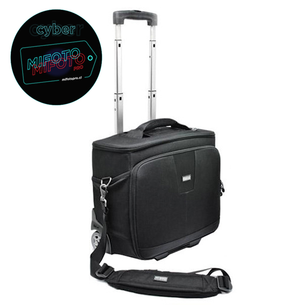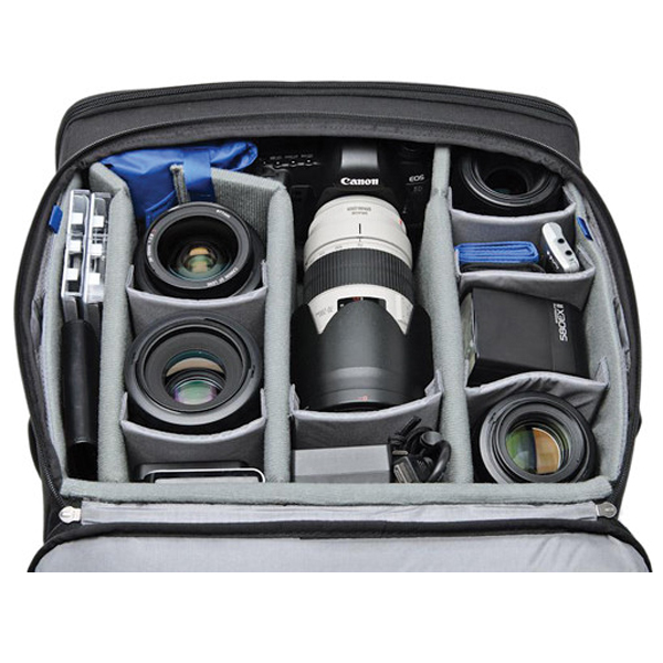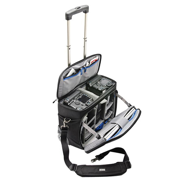 La maleta de viaje Airport Navigator de ThinkTank está repleta de características que la convierten en una buena opción para el profesional que filma bodas, eventos y fotografía de viajes. Cuenta con una buena capacidad de tamaño con espacio para dos cuerpos pro-tamaño que se adaptan uno al lado del otro con Lentes acoplados hasta 70-200 mm f / 2,8 con capucha invertida, más 3-6 Lentes y accesorios adicionales. También hay bolsillos para su iPad y una computadora portátil de hasta 15.4″. Los divisores acolchados ajustables con ajuste táctil le permiten organizar el interior para adaptarse a cualquier equipo que necesite en un día determinado. Su correa de hombro Low Rider funciona como una manga de carro que puede caber sobre un carro rodante opcional más grande. La manija retráctil también puede deslizarse a través de la manga del trole para mantener abierto el compartimiento superior. También se incluye un asa de agarre superior para una recuperación rápida desde un portaequipajes, armario o automóvil. Se puede acceder al compartimiento de almacenamiento principal a través de cremalleras YKK superiores o delanteras. El acceso frontal de la bolsa también contiene correas de soporte en ambos lados que mantienen el compartimento abierto en un ángulo cómodo y también evita que el contenido se derrame. La abertura superior con tres lados con cremallera tiene bolsillos de malla debajo para pequeños accesorios como cables, baterías y teléfono celular. Se proporcionan dos bolsillos laterales con el tamaño adecuado para guardar sus unidades de flash o botellas de agua. Una ranura para tarjetas con cremallera en la parte superior de la tapa es un buen lugar para almacenar su pasaporte, boleto y otros artículos de acceso rápido. Las cremalleras de los compartimentos superior y frontal se pueden cerrar con candados provistos por el usuario. El exterior está hecho de una combinación de poliuretano resistente al agua, nylon y poliéster. El interior es de polietileno con espuma de celda cerrada, nylon y malla. Las cremalleras son todas de diseño YKK. Se incluye una funda para lluvia para proteger toda la bolsa cuando está al aire libre.